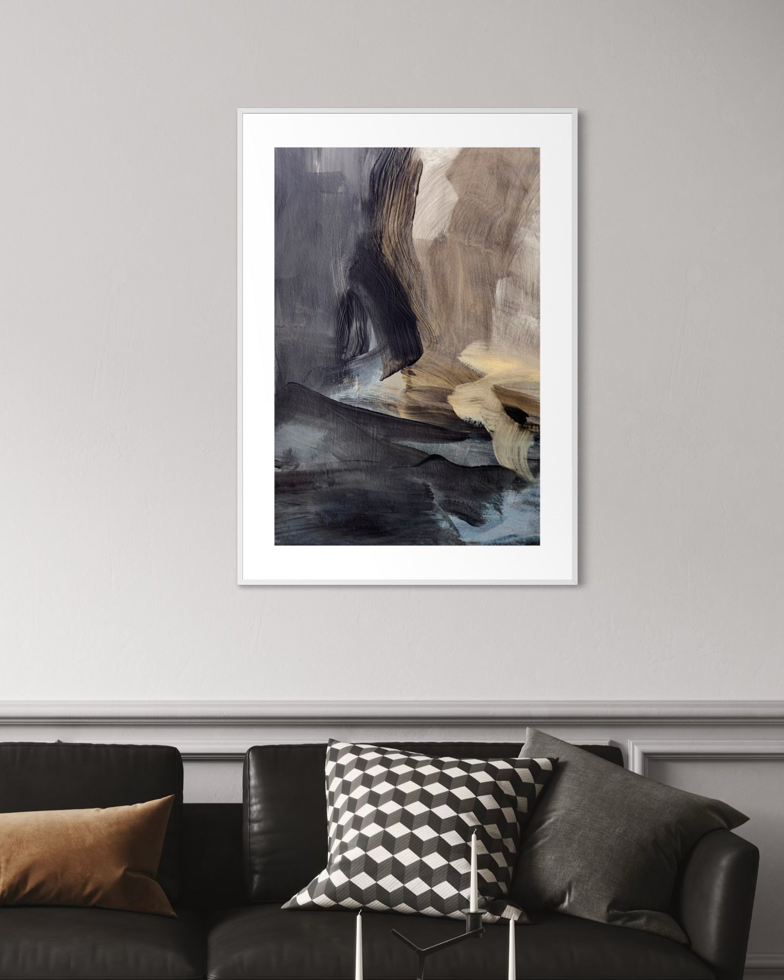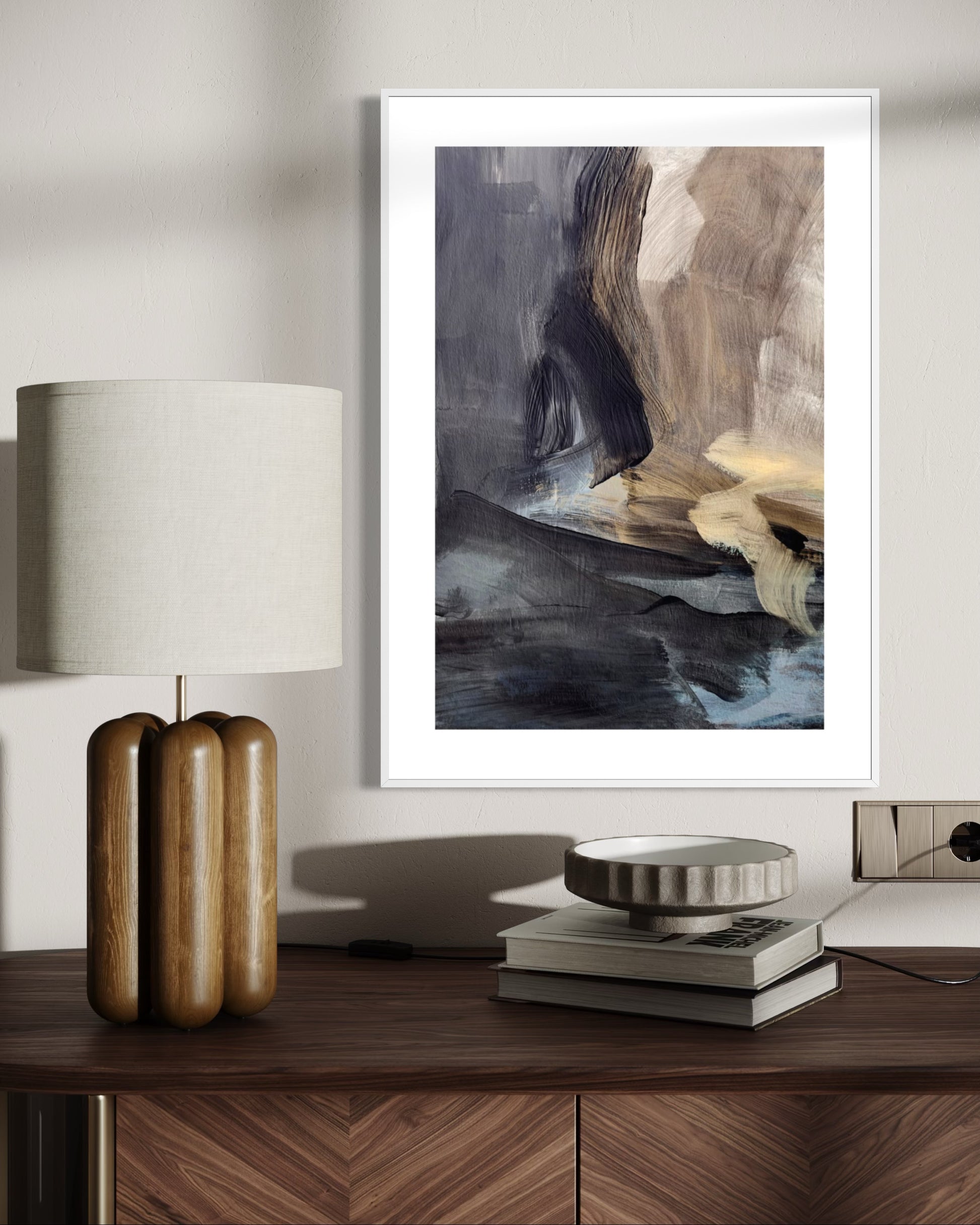 Plakat abstrakcyjny o głębokiej, ekspresyjnej kompozycji w odcieniach granatu, beżu, kremu i ziemistych brązów. Pociągnięcia pędzla tworzą dynamiczne formy, które pobudzają wyobraźnię i nadają wnętrzu artystycznego charakteru. Subtelna gra światła i cienia sprawia, że obraz przyciąga wzrok, emanując spokojem i elegancją.
