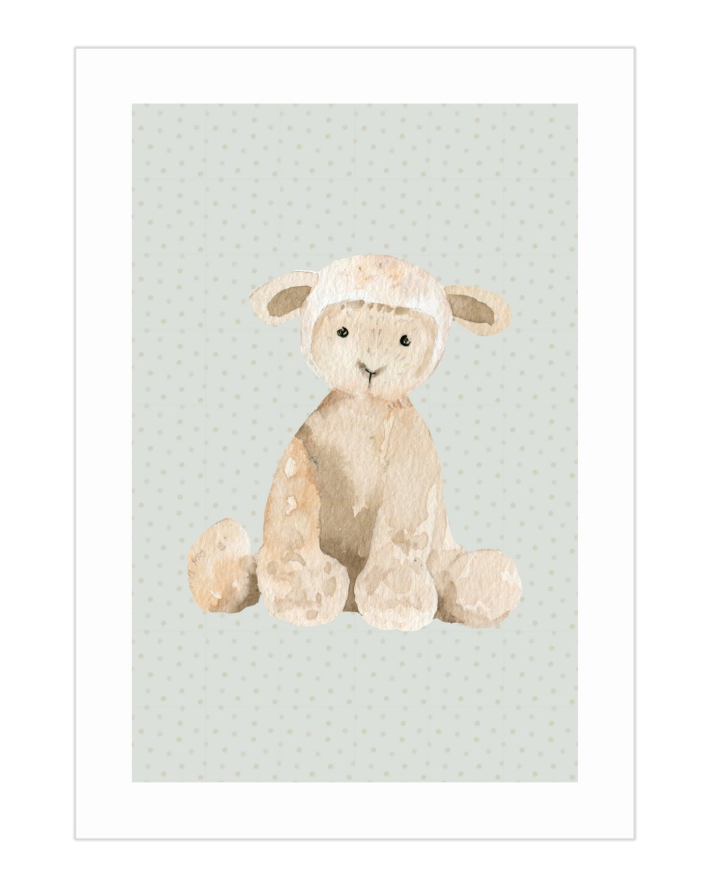 Uroczy plakat dziecięcy w delikatnych pastelowych barwach przedstawiający słodkiego akwarelowego baranka na subtelnym tle w jasnoszare kropki. Delikatna kolorystyka beżu i szarości tworzy spokojną, przyjazną atmosferę, doskonale nadającą się do dziecięcego pokoju, sypialni malucha lub kącika zabaw. Plakat stworzy przestrzeń pełną ciepła, czułości i niewinności.