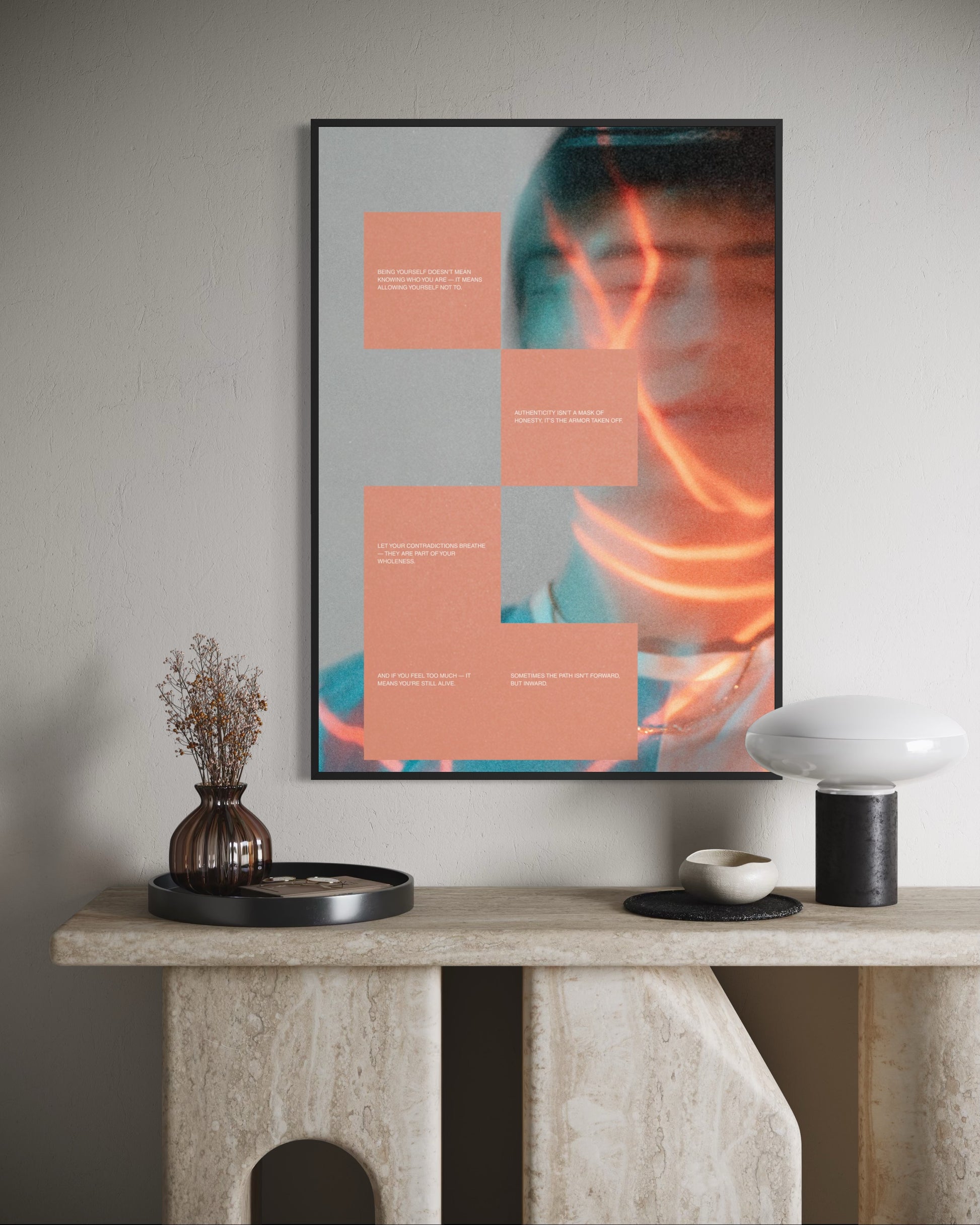 Rozmyte światło i portret symbolizują złożoność tożsamości. Przesłanie skupia się na autentyczności jako drodze – nie celu. Na akceptacji sprzeczności, emocji, zmienności.
