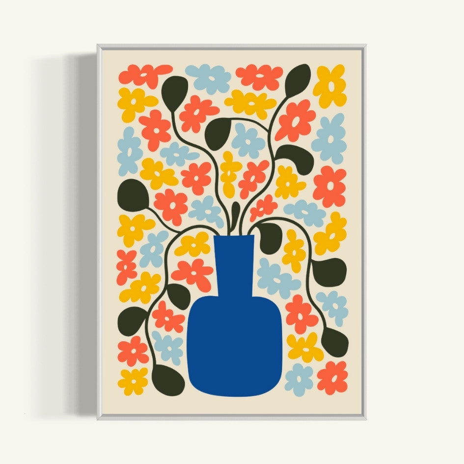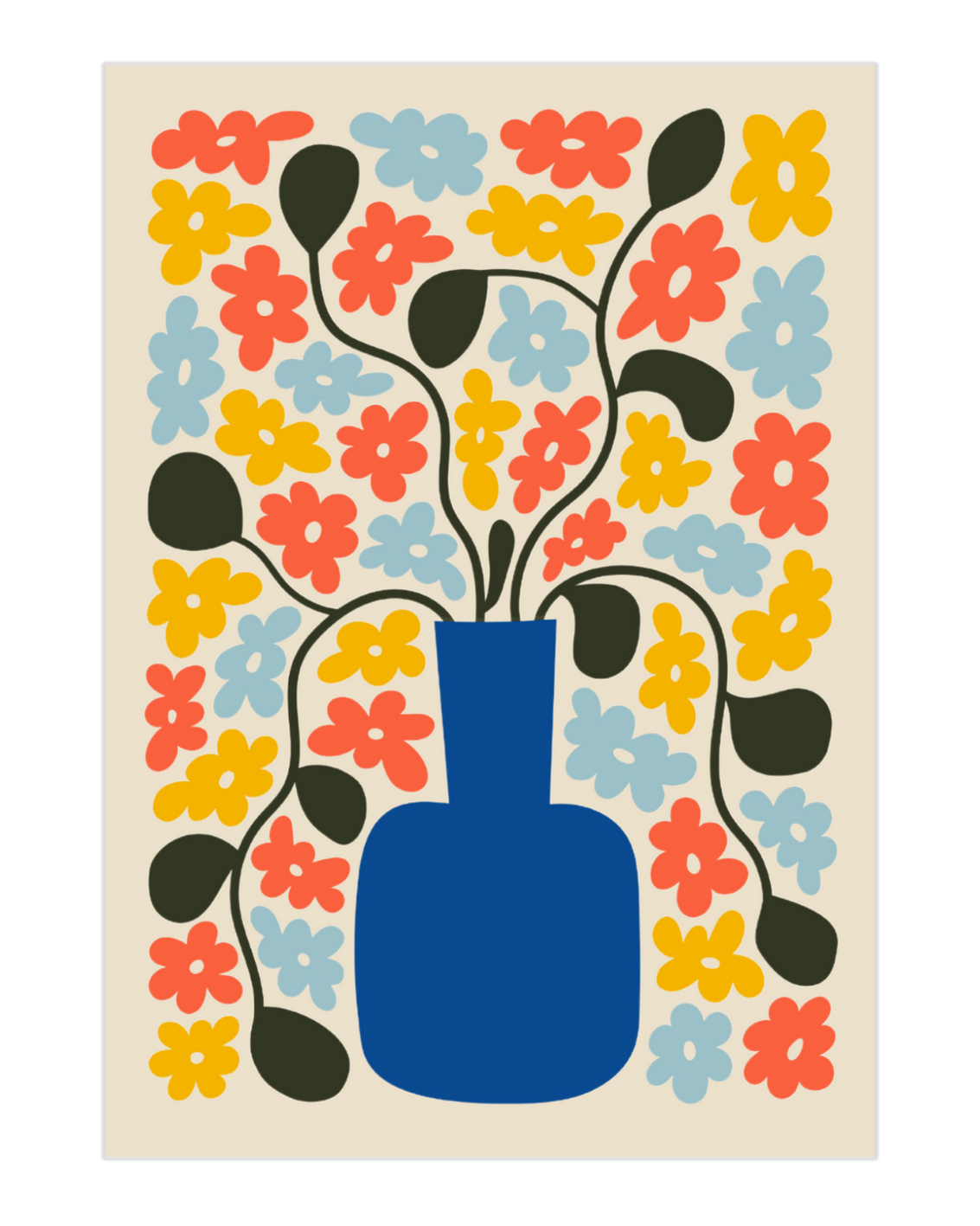 Plakat tętniący kolorami i pozytywną energią. Wyrazista, graficzna kompozycja z bukietem kwiatów w intensywnie niebieskim wazonie to propozycja dla miłośników barwnego designu i stylu retro. Prosty, ale jednocześnie bardzo dekoracyjny — dodaje życia każdej przestrzeni.