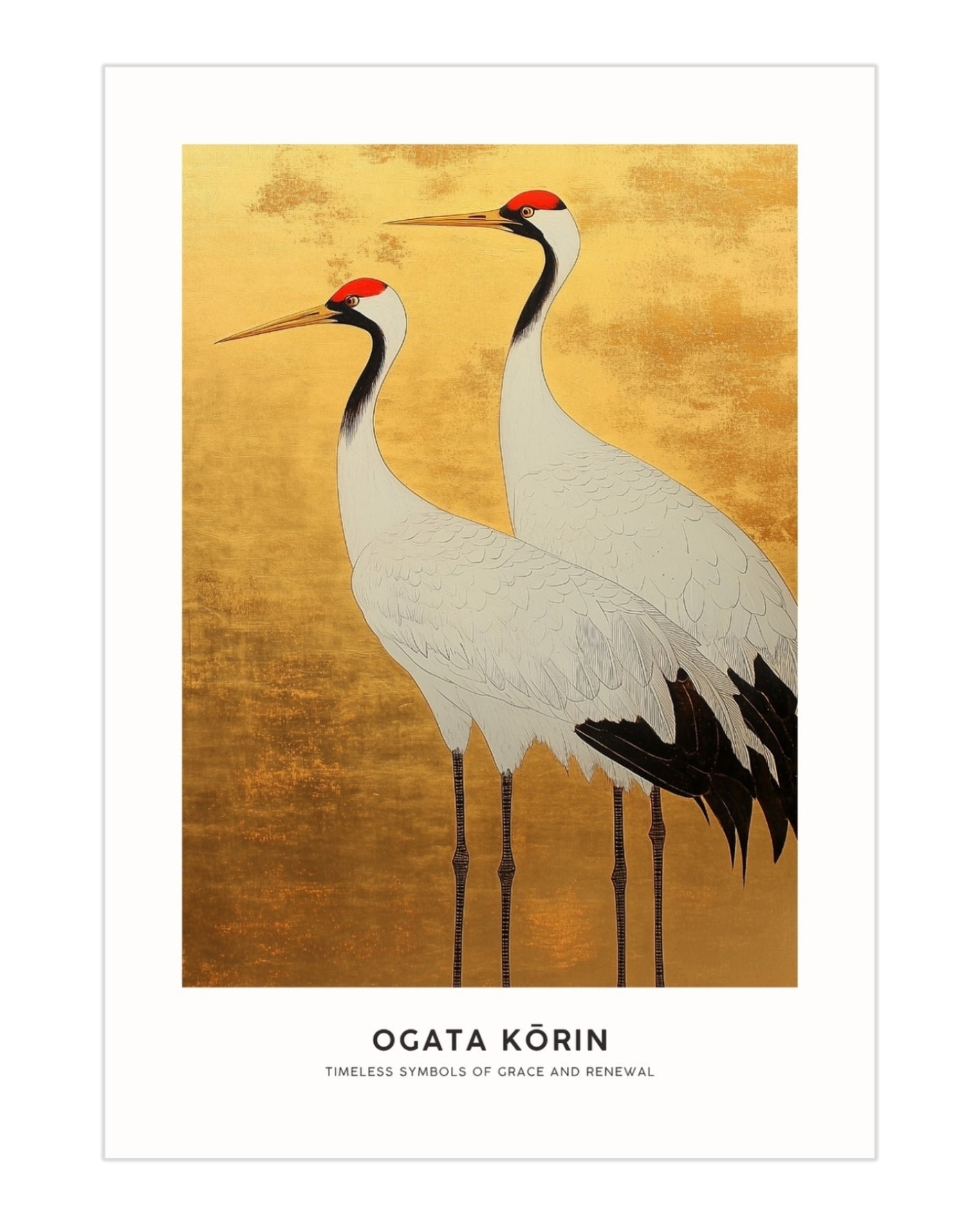 Dwa żurawie w stylu tradycyjnej japońskiej ilustracji, namalowane bardzo szczegółowo, z dramatycznym zestawieniem kolorów. Tło w ciepłych złotych barwach dodaje kompozycji głębi i kontrastu.
