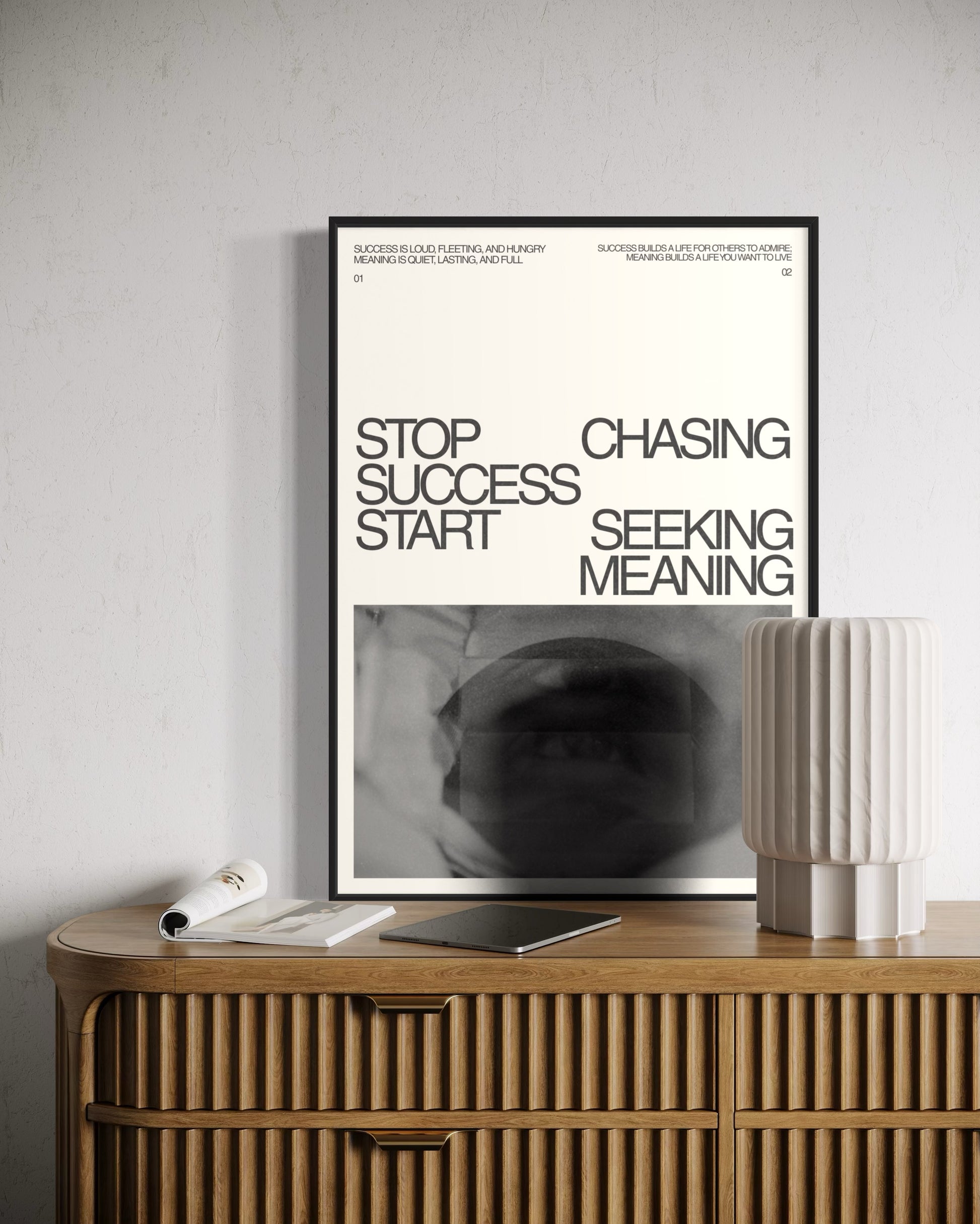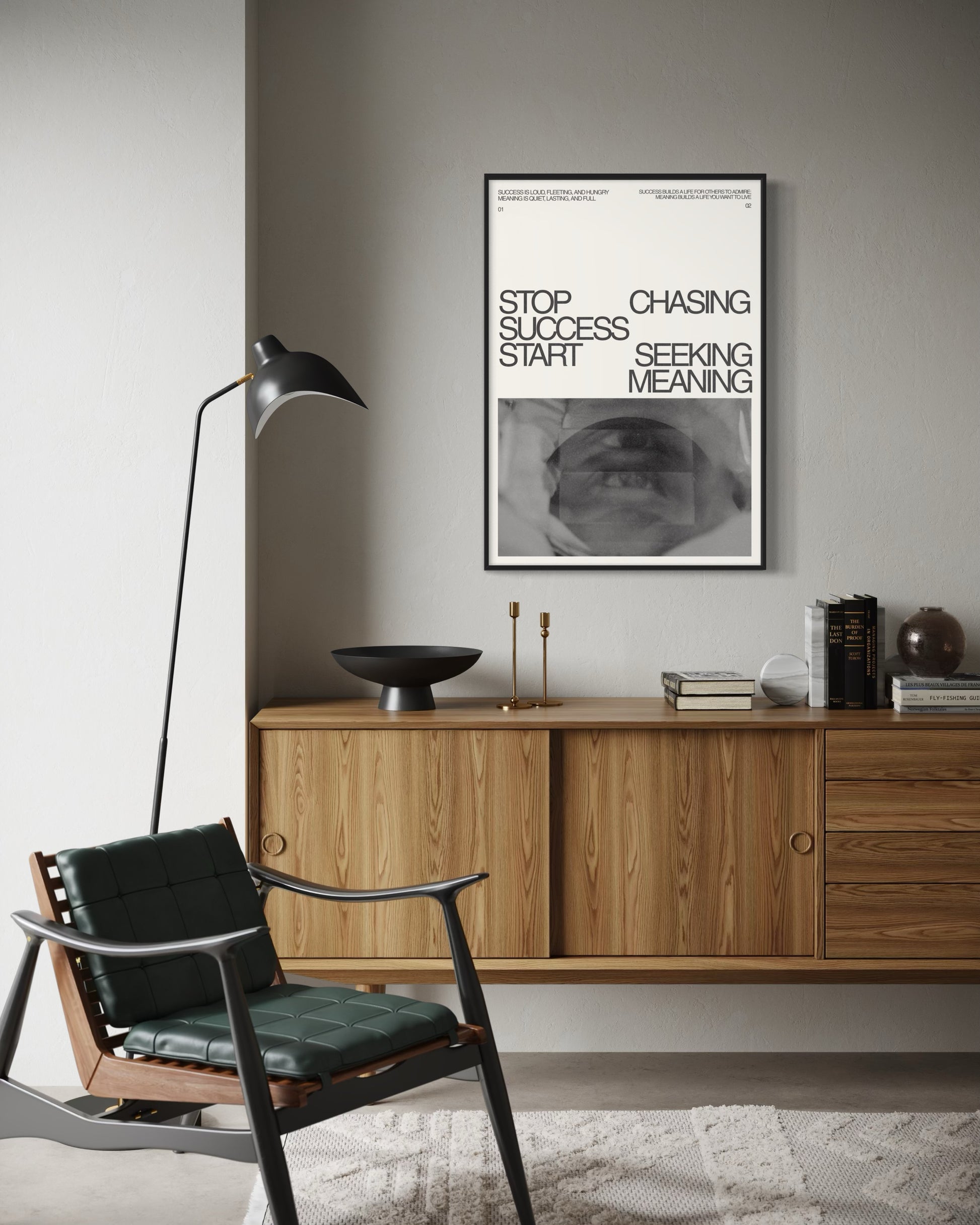 Typograficzny plakat o silnym, kontemplacyjnym przekazie, który zachęca do redefinicji naszych ambicji. Surowa kompozycja w duchu estetyki brutalizmu łączy minimalistyczną formę z głębokim przesłaniem: sukces to zewnętrzna fasada, podczas gdy sens rodzi się w ciszy i autentyczności.