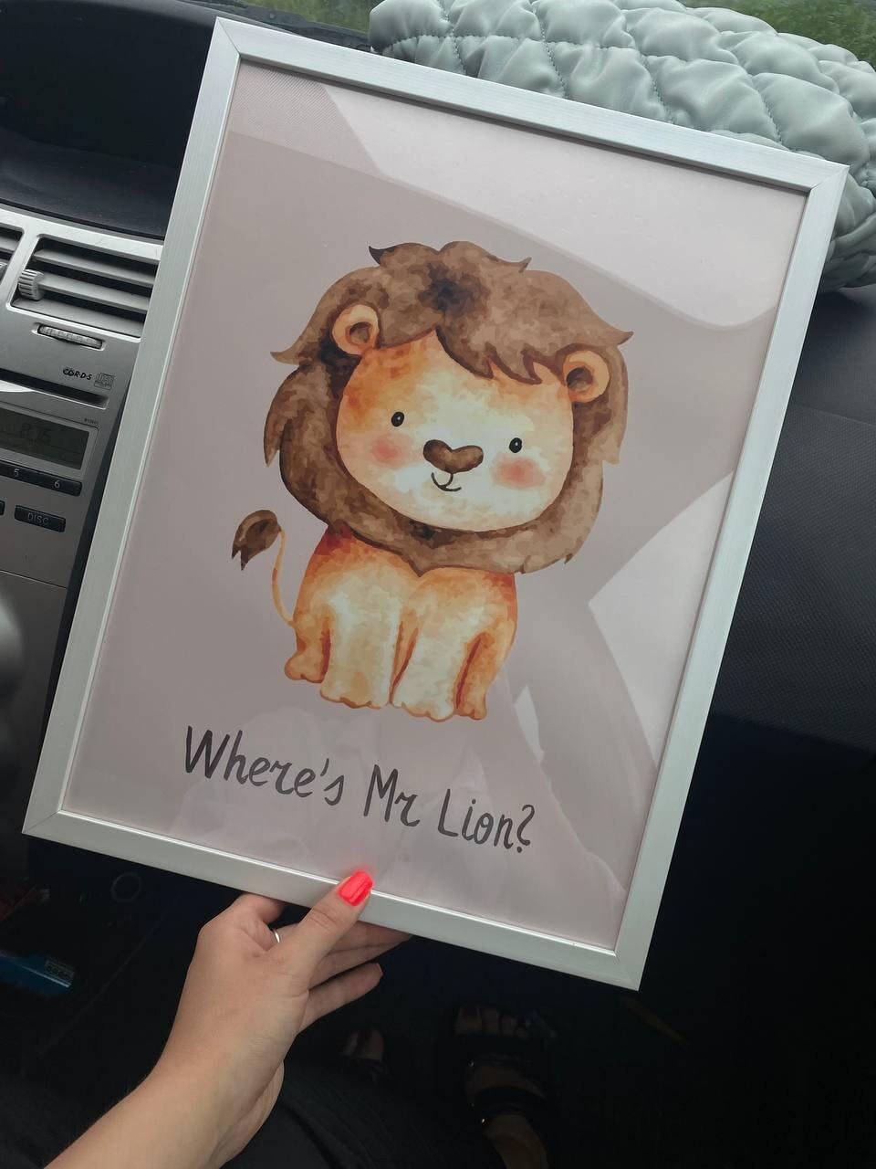 Ten uroczy plakat z małym, uśmiechniętym lwem to doskonała dekoracja do dziecięcego pokoju. Ilustracja akwarelowa w ciepłych, naturalnych odcieniach beżu, brązu i pomarańczy wprowadza przyjazną atmosferę i nadaje przestrzeni miękkości. Zabawny napis „Where’s Mr Lion?” dodaje charakteru i stymuluje dziecięcą wyobraźnię — idealny do kącika do zabawy, nad łóżeczkiem lub w przedszkolnym zakątku.