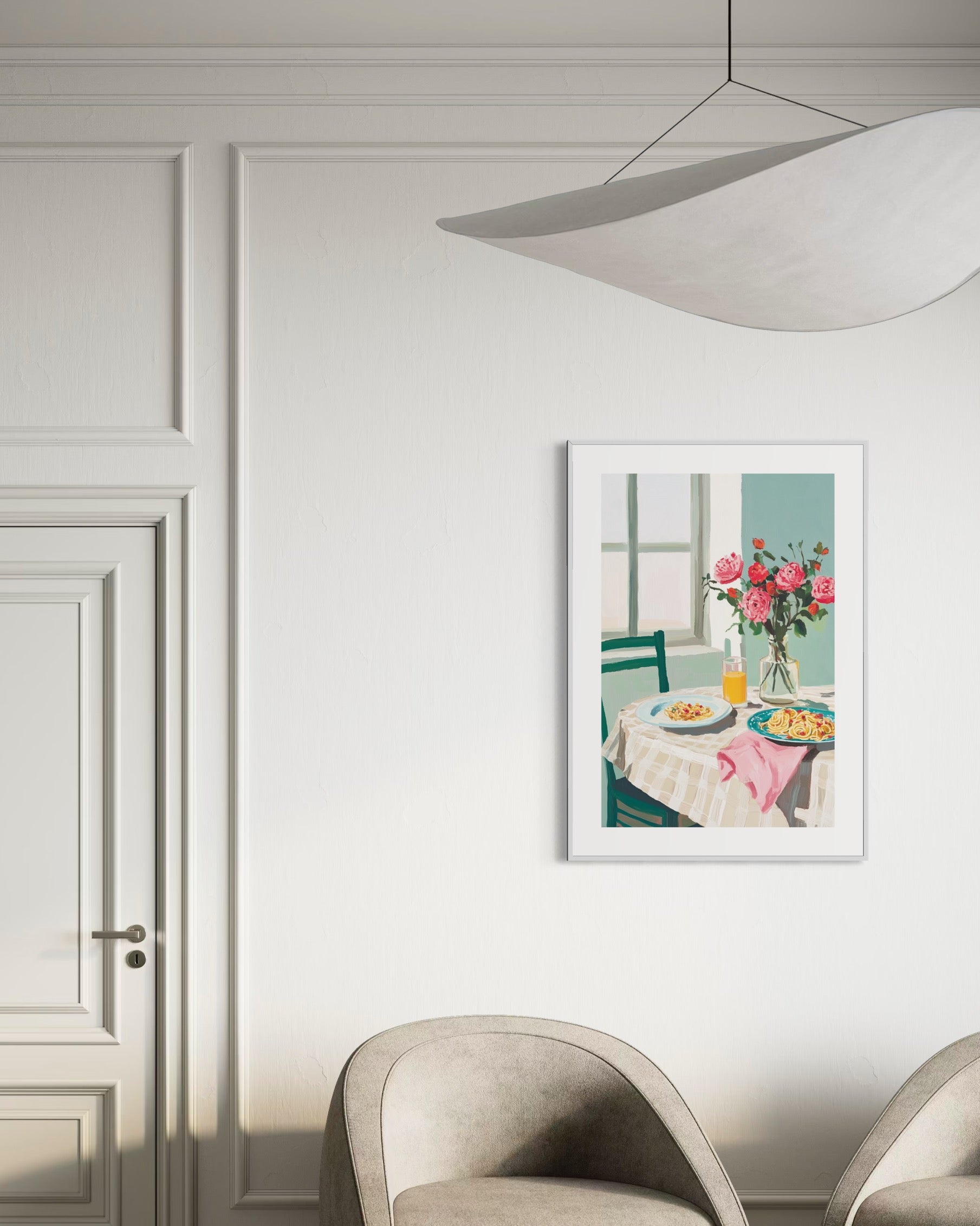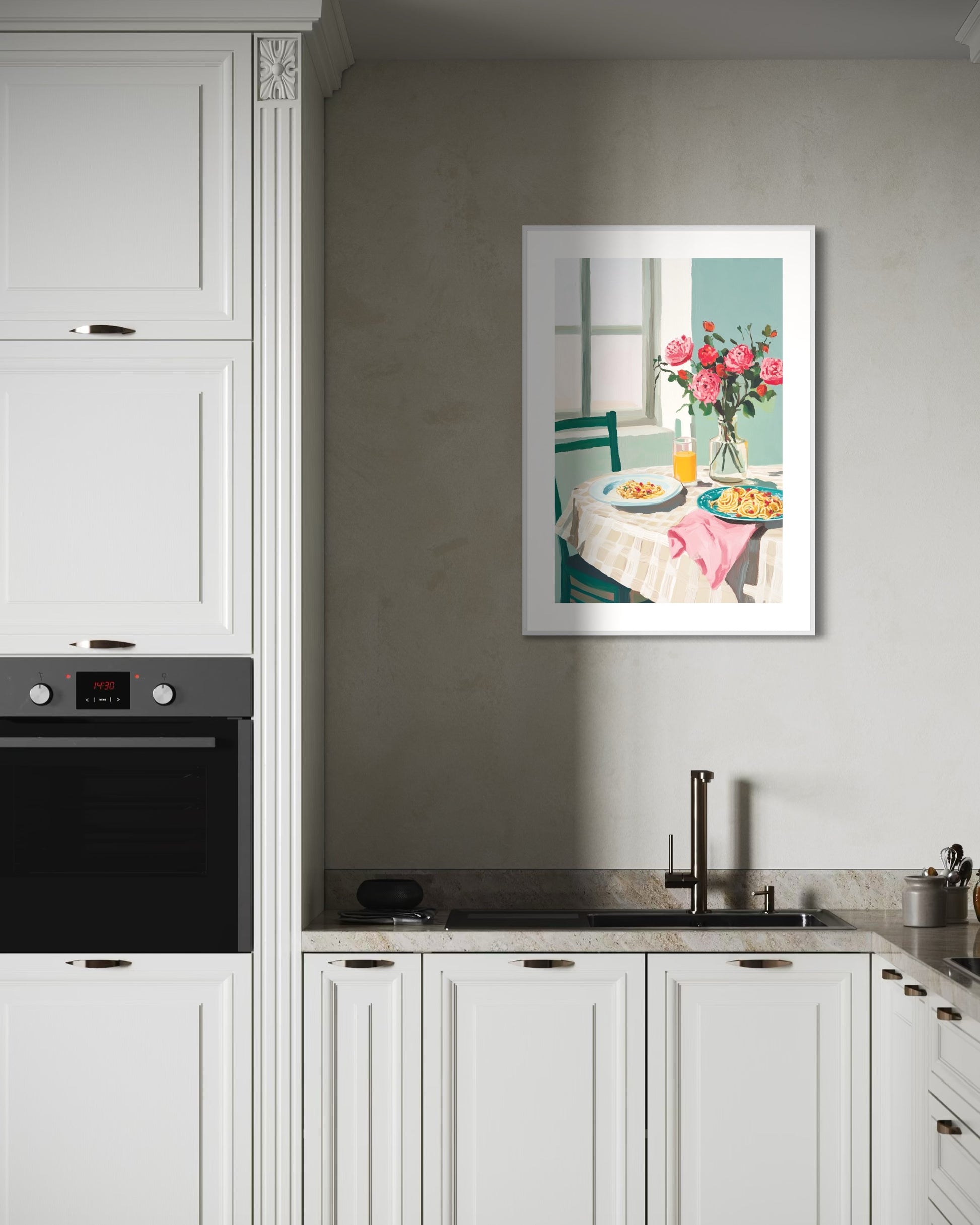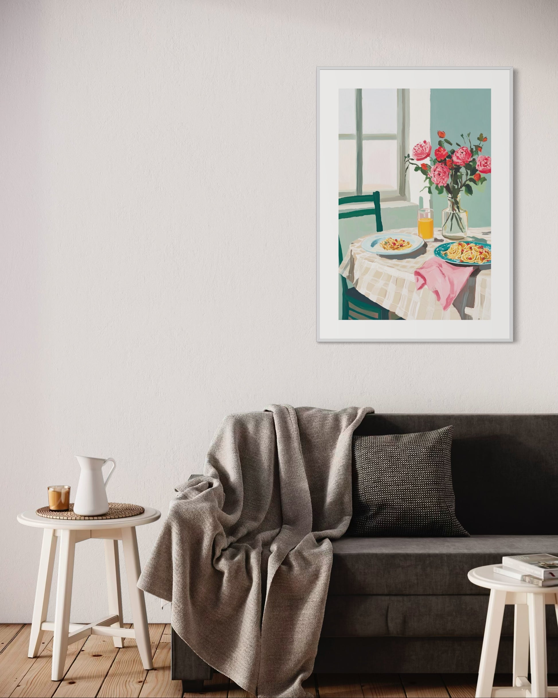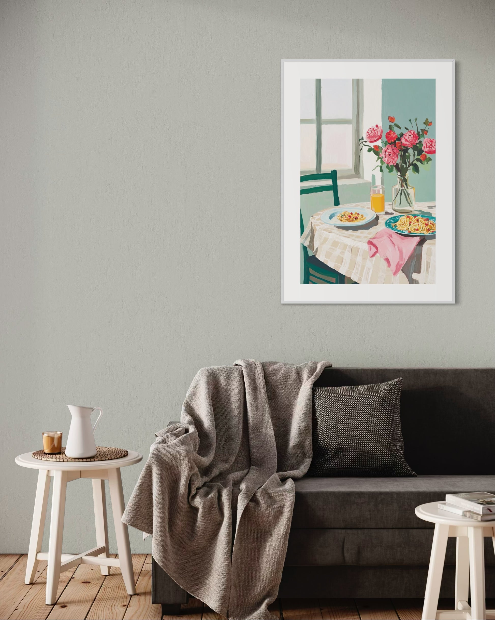 Plakat przedstawiający wnętrze pomieszczenia, na stole obrus w kratkę, talerze z makaronem, wazon z różowymi kwiatami, szklanka z sokiem pomarańczowym. Styl malarski, delikatne i jasne odcienie z przewagą bieli, różu i turkusu. W tle widoczne okno i fragment krzesła.