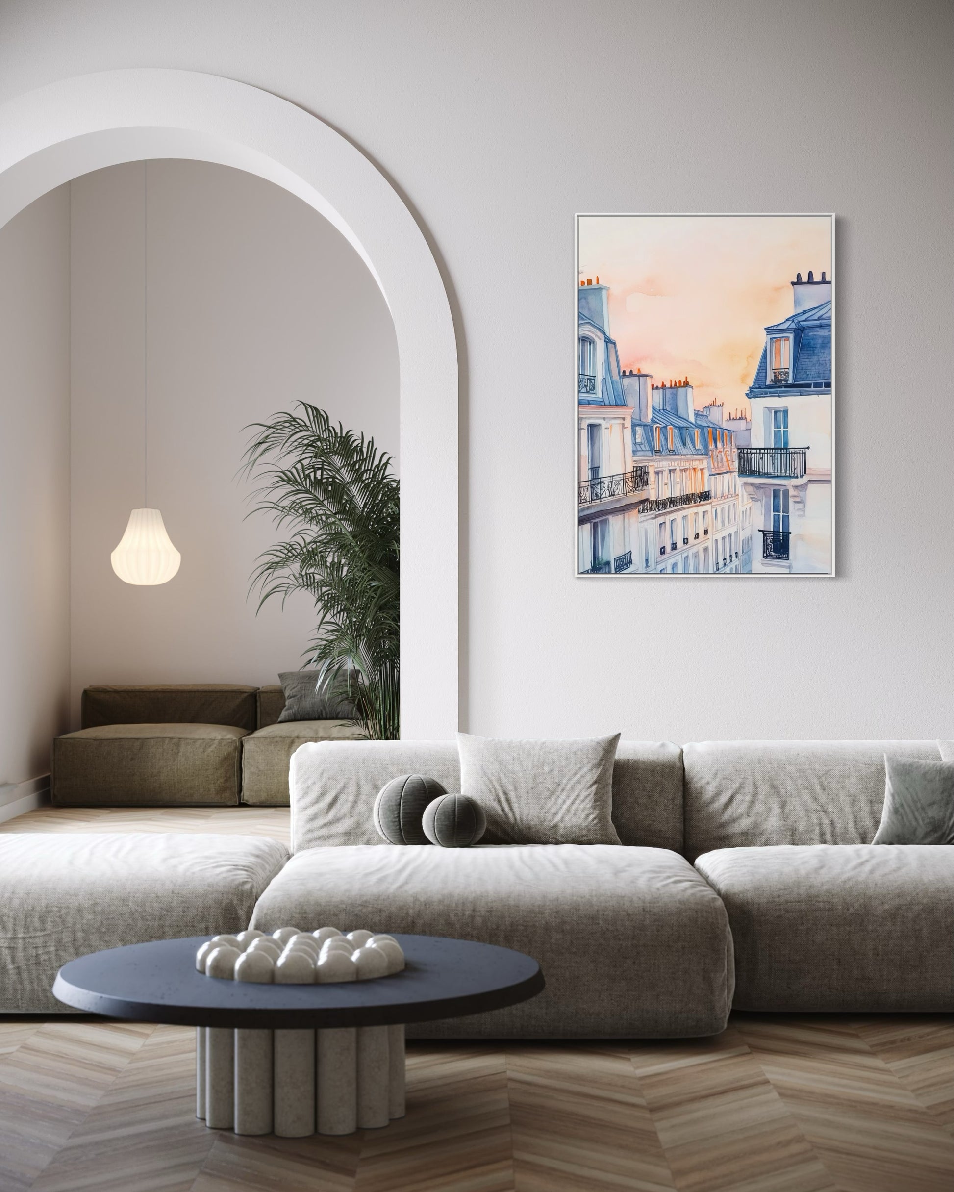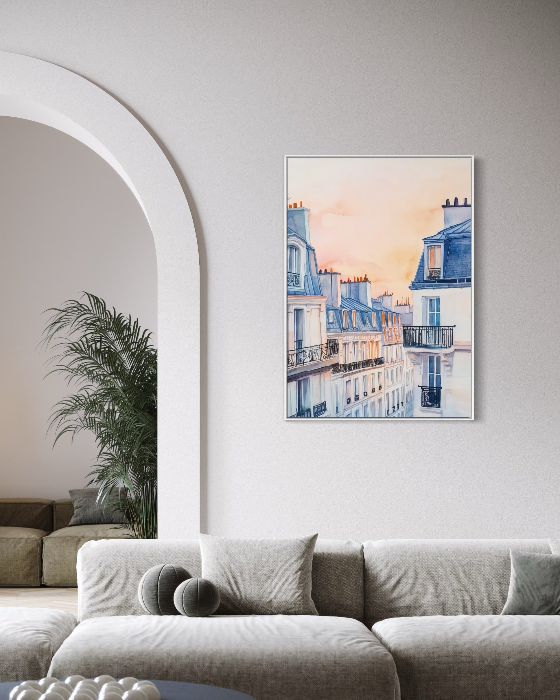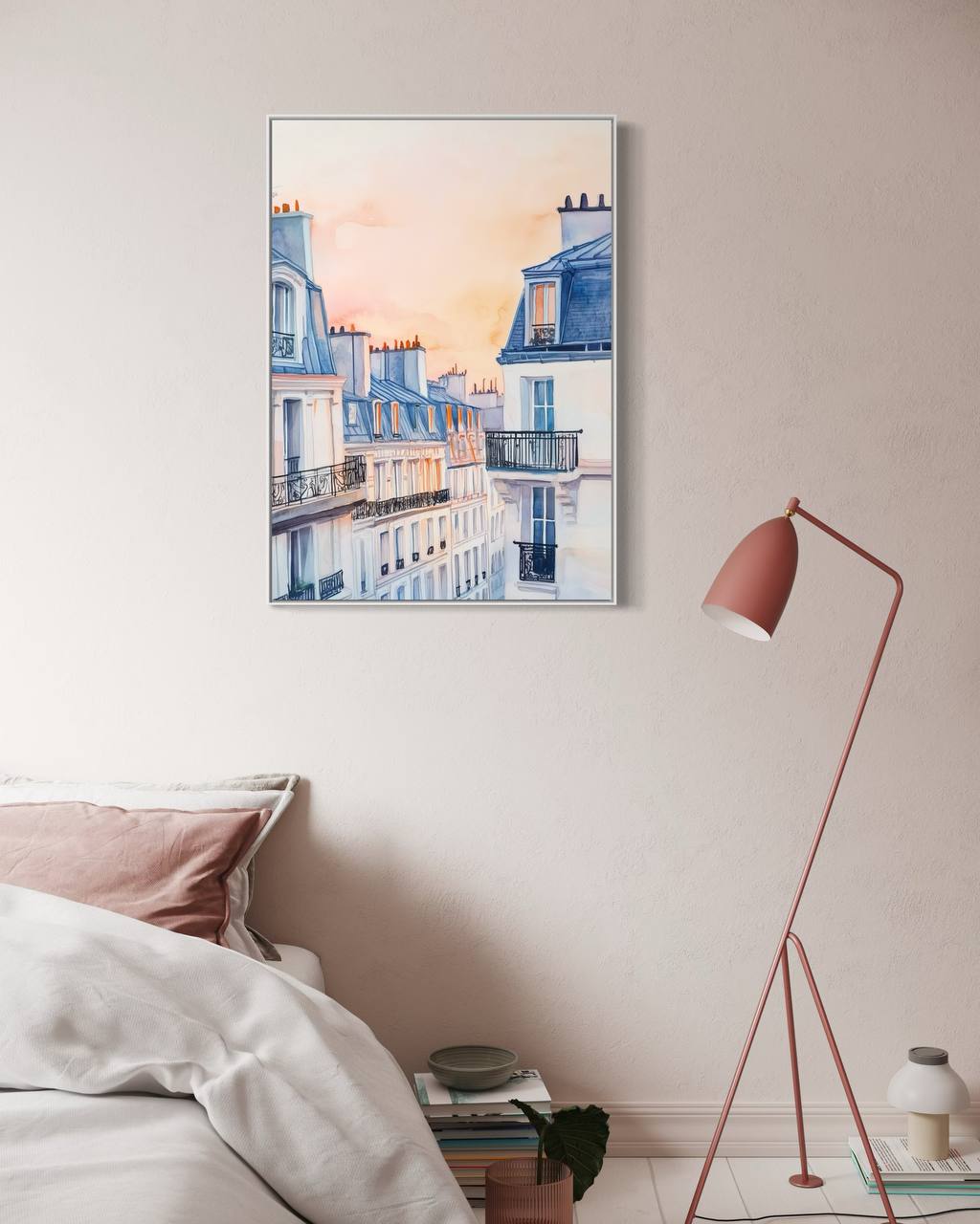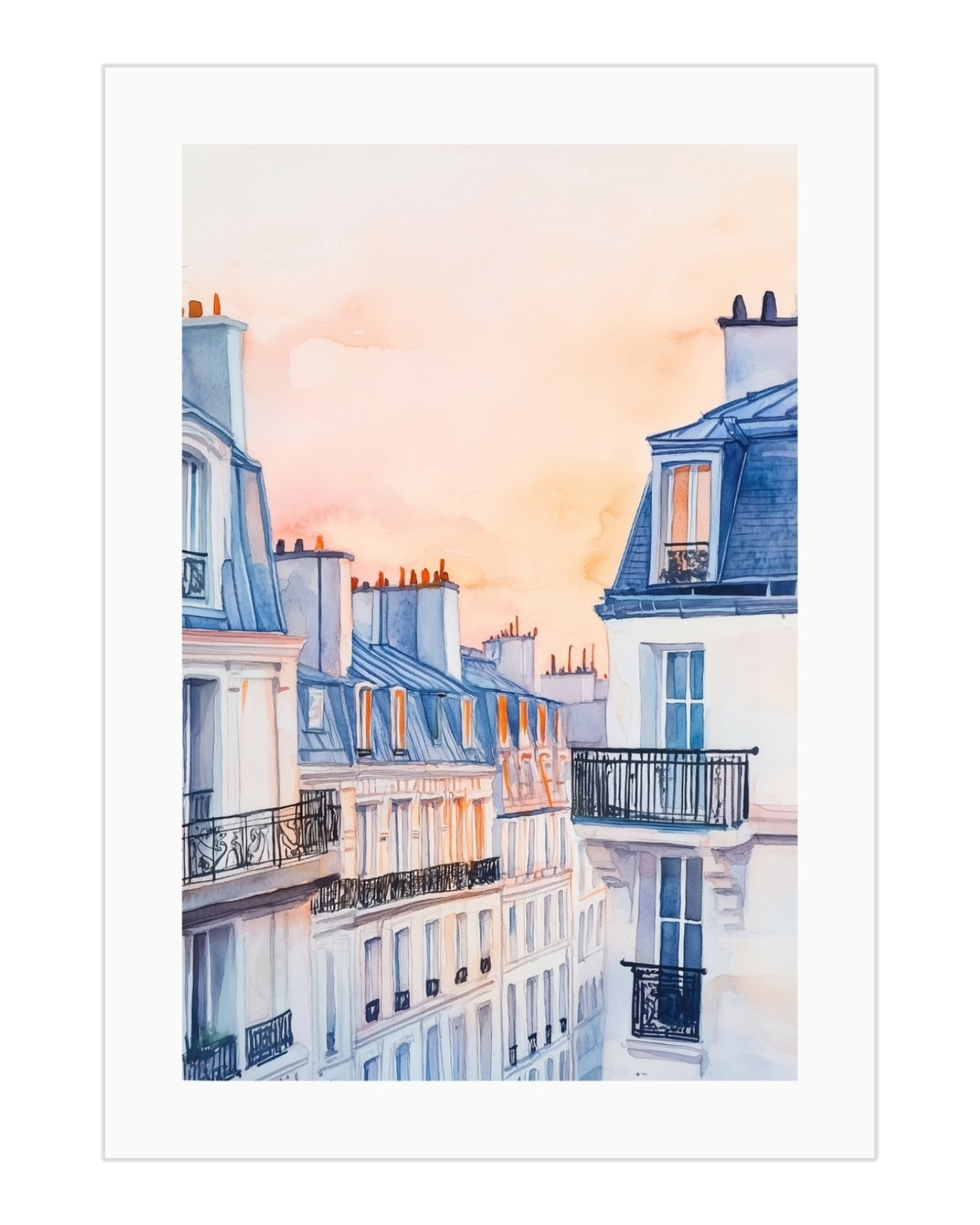 Grafika przedstawia akwarelowy widok na fasady typowych paryskich kamienic. Budynki w odcieniach różu, beżu i błękitu z charakterystycznymi dachami mansardowymi. Tło w pastelowym różu.