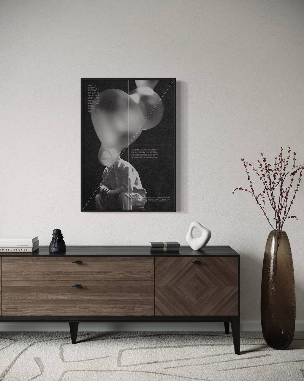 Postać z przerysowaną, abstrakcyjną głową – jakby myśli stały się formą. Plakat mówi o złożoności bycia – o tym, że jesteśmy nie tylko obrazem, ale i jego zakłóceniem. Wizualny manifest z pogranicza designu i filozofii.