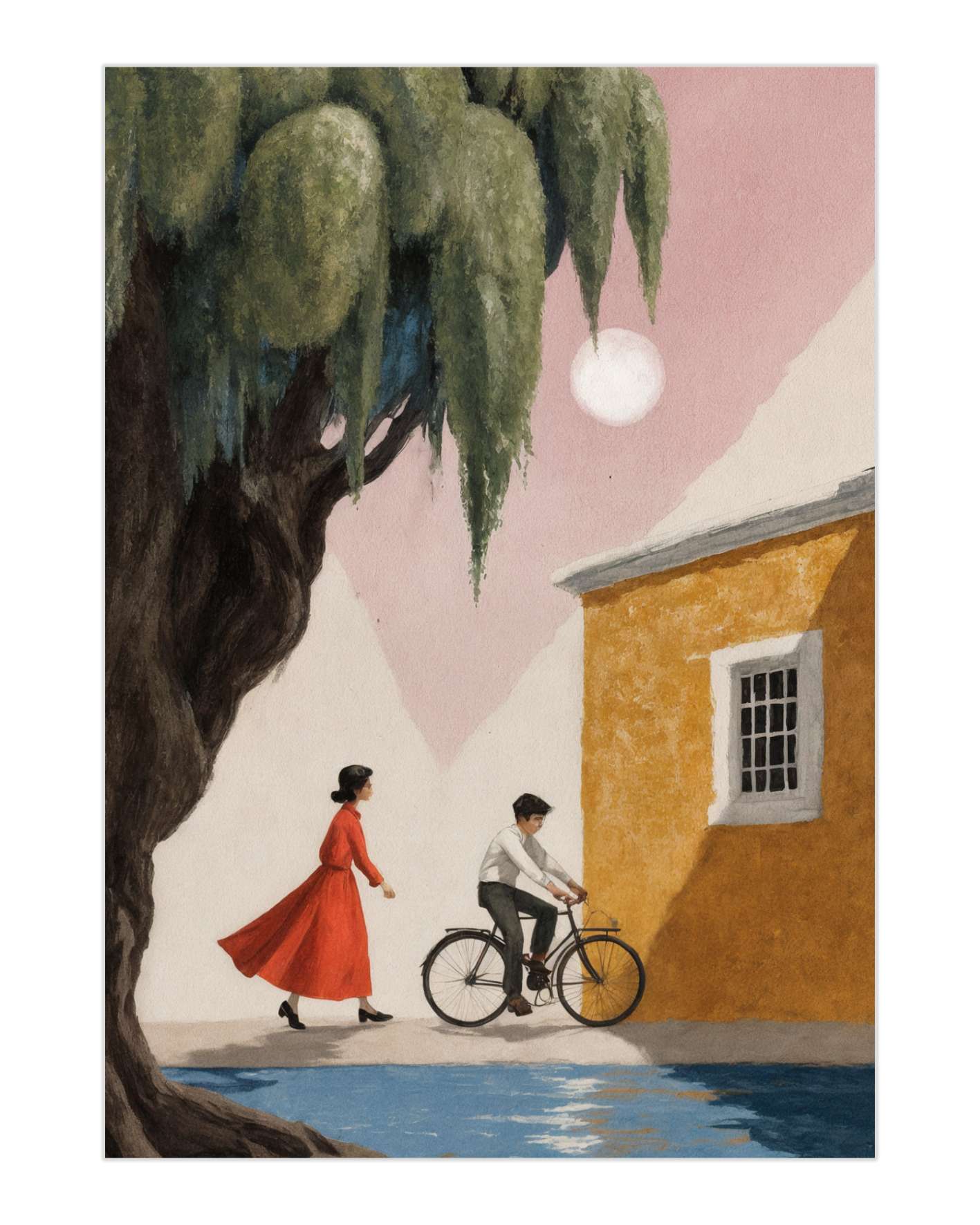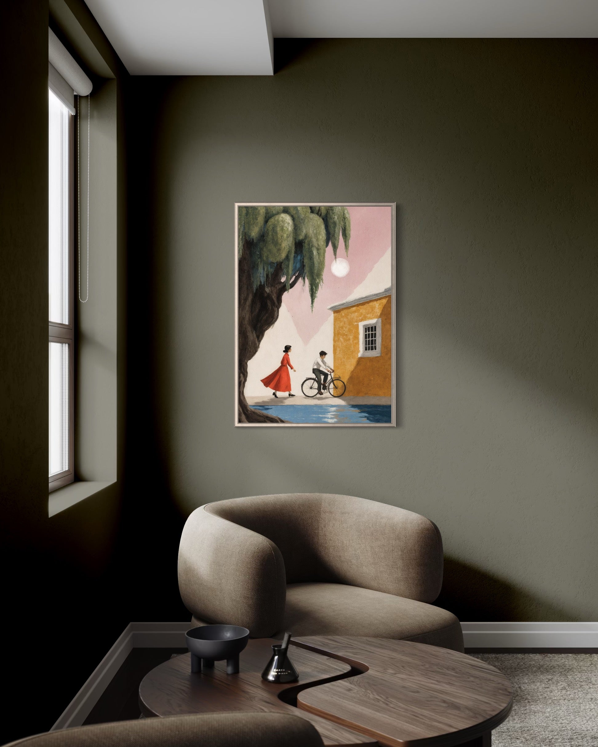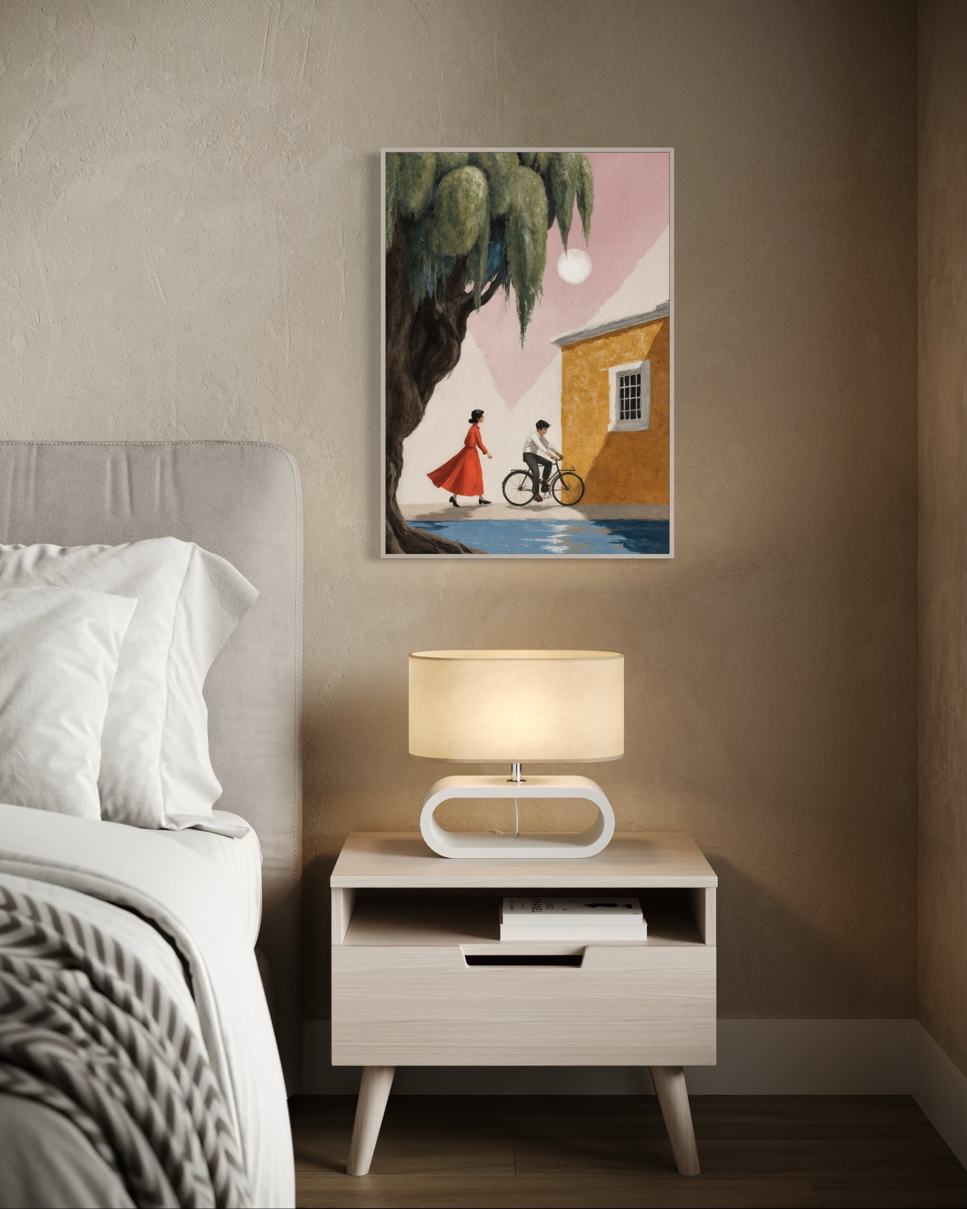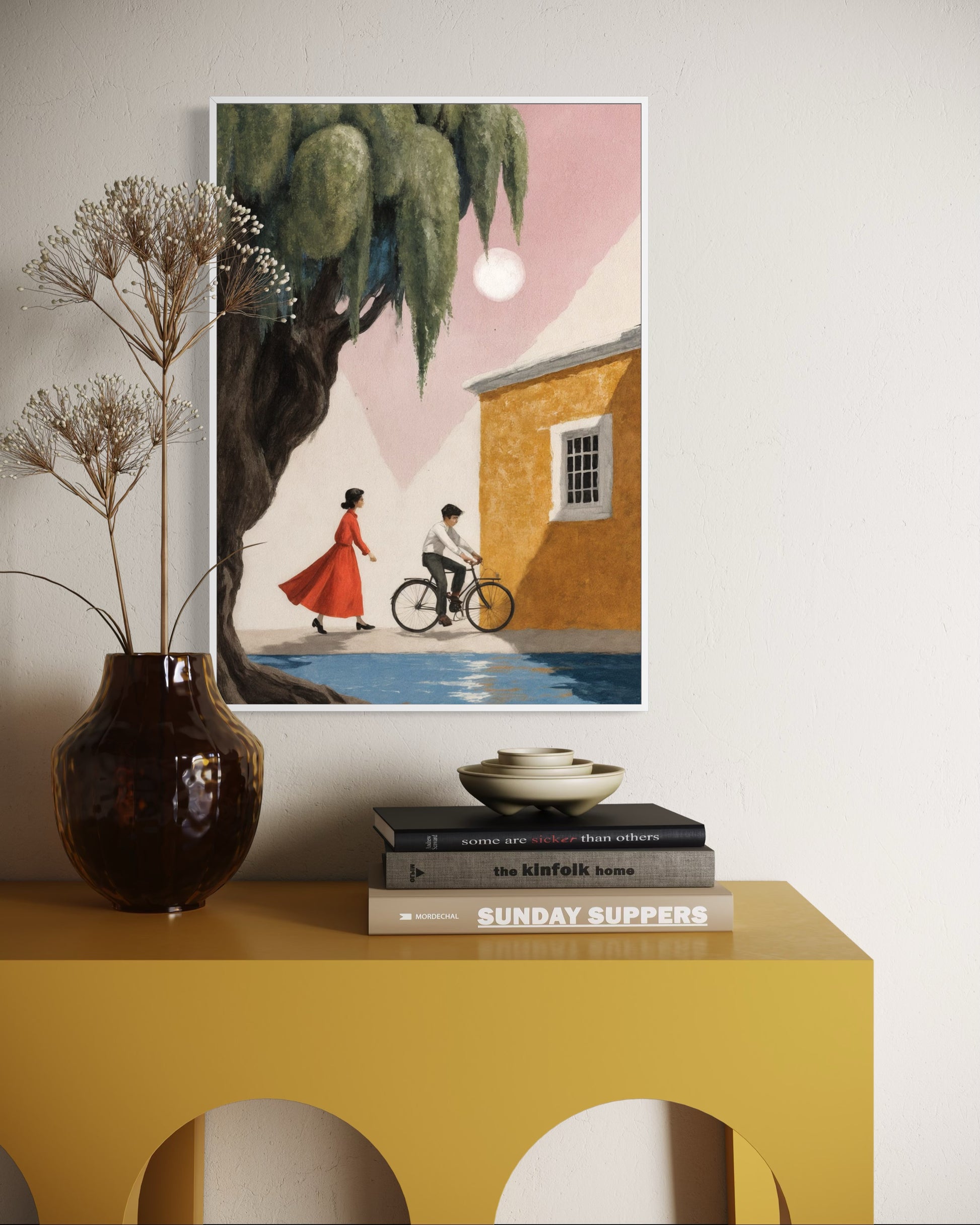 Romantyczna scena przedstawiająca kobietę w czerwonej sukni i mężczyznę jadącego na rowerze wzdłuż żółtej, słonecznej ściany. Nad nimi unosi się miękkie, różowe niebo z jasnym księżycem, a cień wielkiego drzewa dodaje kompozycji głębi i nastrojowości.