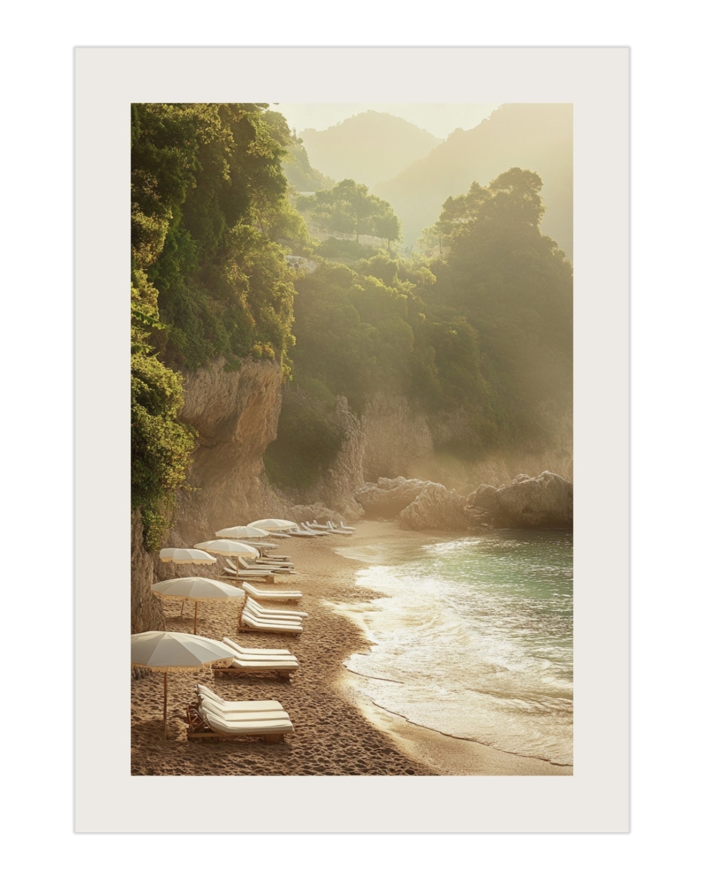 Atmosferyczny plakat z widokiem na zaciszną, słoneczną plażę otoczoną zielonymi klifami. Leżaki i parasole ustawione wzdłuż brzegu tworzą relaksującą, niemal filmową scenerię, która przywodzi na myśl spokojne poranki nad Morzem Śródziemnym. Ciepłe światło, miękkie kontury i naturalne barwy nadają kompozycji wyjątkowego uroku i spokoju.