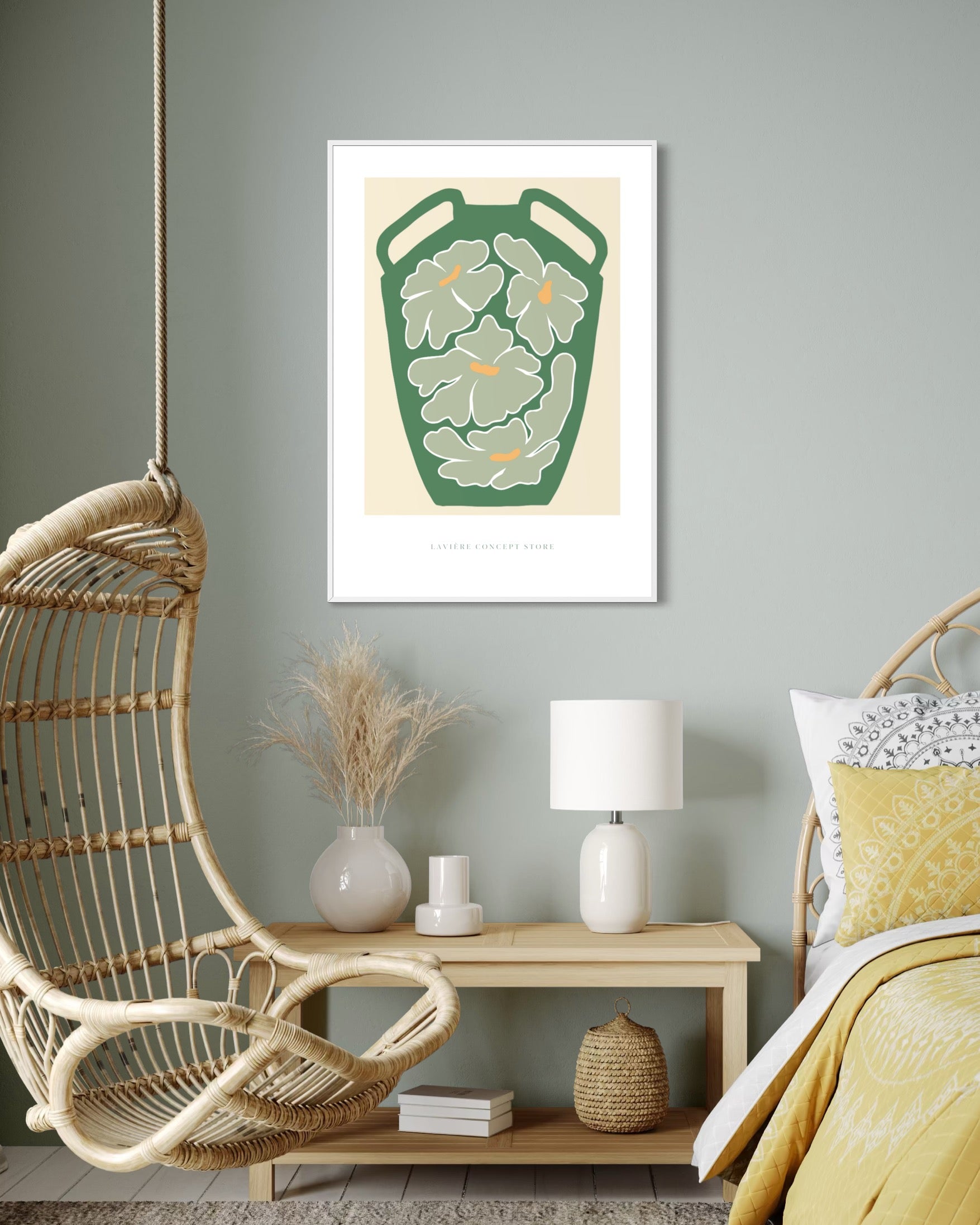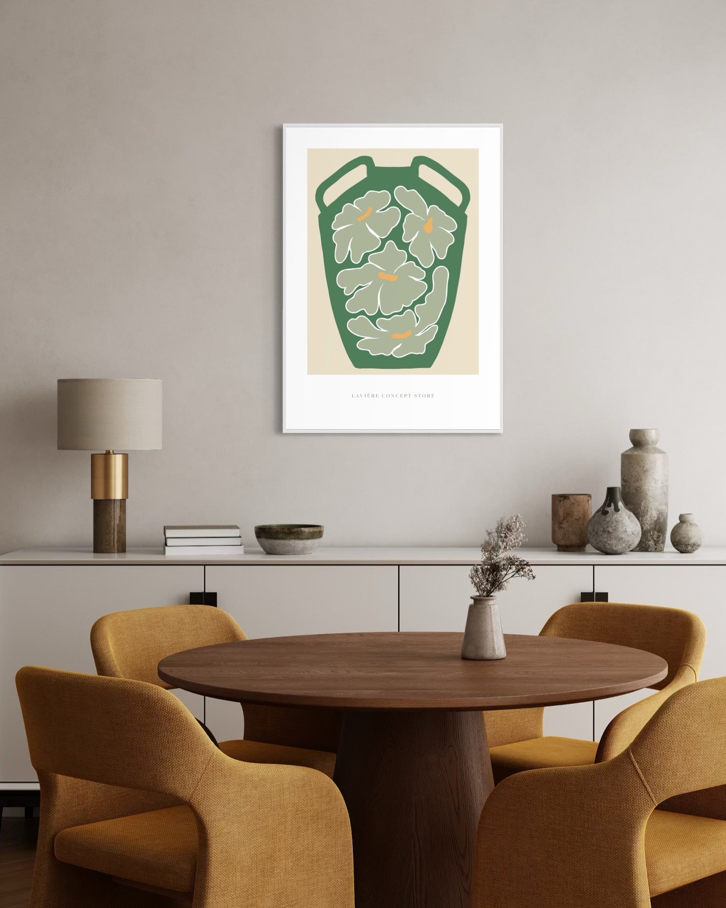 Nowoczesny plakat przedstawiający dekoracyjny wazon w odcieniu butelkowej zieleni, wypełniony stylizowanymi kwiatami w kremowych i pistacjowych tonacjach z akcentami ciepłej ochry. Kompozycja inspirowana stylem minimalistycznym i mid-century modern, łączy w sobie prostotę formy i subtelny dekoracyjny rytm.