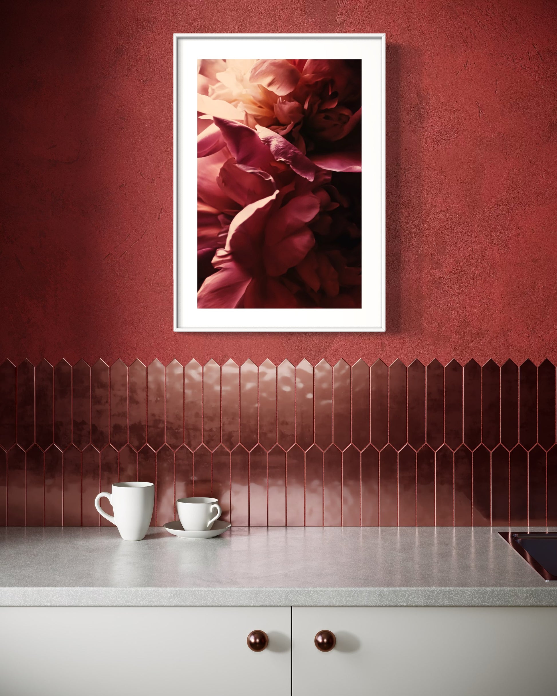 Elegancki plakat fotograficzny ukazujący zmysłowe, głęboko nasycone kwiaty piwonii w odcieniach różu, bordo i kremu. Kompozycja emanuje romantyzmem, subtelnością i nutą tajemniczości, przyciągając wzrok grą światła i cieni. Ten obraz to kwintesencja kobiecej delikatności i wyrafinowanego piękna natury, która wprowadzi do wnętrza atmosferę spokoju i elegancji.