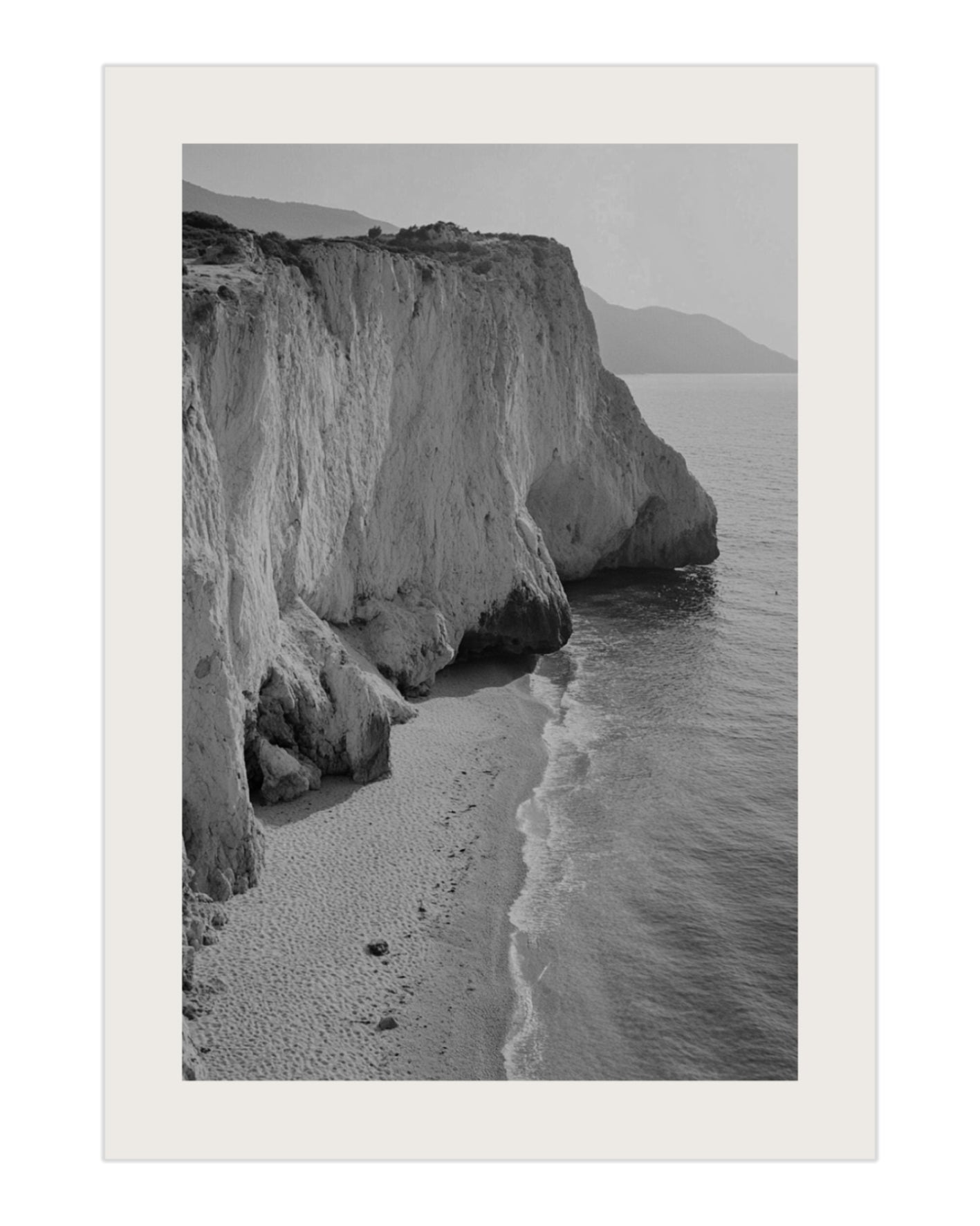 Minimalistyczny plakat w czarno-białej tonacji, przedstawiający majestatyczne, jasne klify opadające wprost do spokojnego morza. Delikatna fala muskająca brzeg oraz miękka faktura piasku tworzą wyważoną, spokojną kompozycję o wyjątkowej elegancji. Czarno-biała estetyka nadaje plakatowi ponadczasowego charakteru i fotograficznej klasyki.